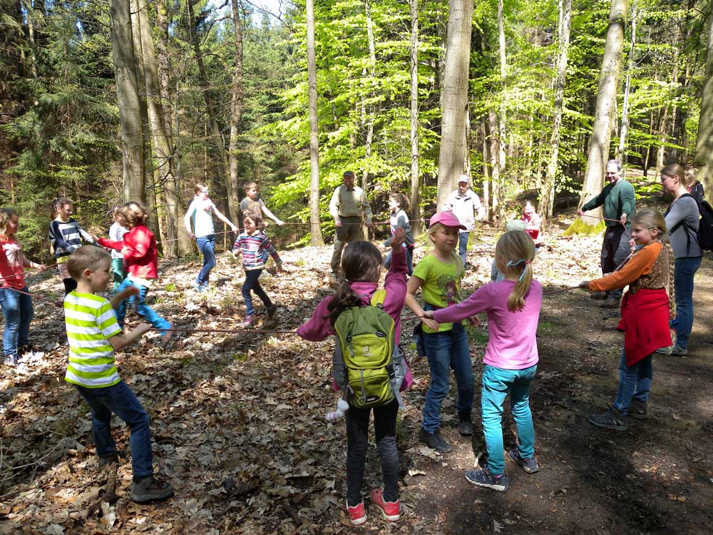 Mit der Lupe untersuchten wir Blätter und Rinde und entdeckten das Nest eines Baumläufers, lernten: wenn alle mit anpacken können wir ganz leicht auf einem Seil gehen.