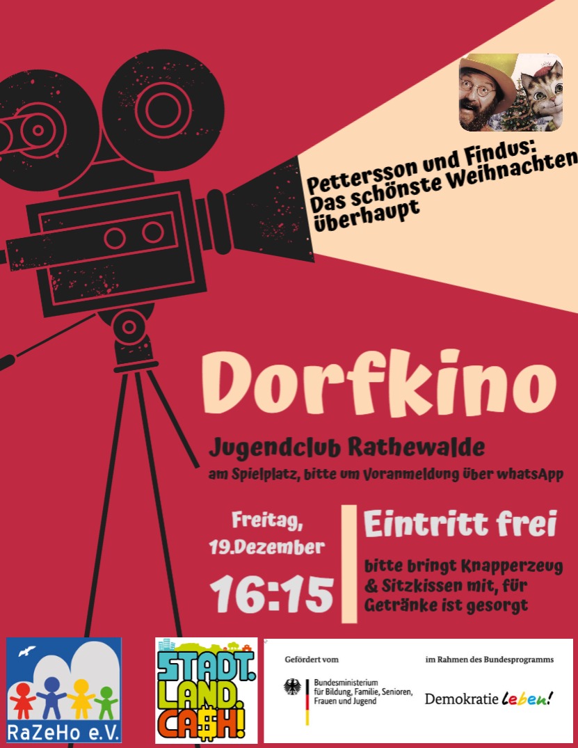 Die Jugendlichen unseres RaZeHo e.V. wünschten sich einen Beamer, um gemeinsame Filmabende veranstalten zu können. Im Rahmen des Bundesprogramms „Demokratie leben!“ und aus Mitteln des Freistaates Sachsen erhielten wir die finanzielle Förderung für einen Beamer und Leinwand, sodass am 19.12.2025 unser 1. Dorfkino im Jugendclub Rathewalde stattfand.