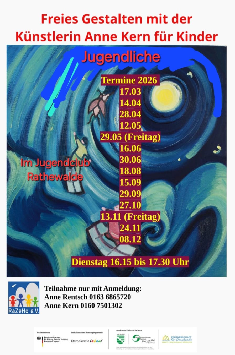 Unser jährliches Frühlingsfest auf dem Spielplatz in Rathewalde findet Mitte April statt. Es wird wieder verschiedene Spielstationen geben und unser beliebtes Kinderschminken, Kaffee & Kuchen, Grillen. Möchtet ihr Ideen umsetzen oder mit helfen, meldet euch gern. Natürlich freuen wir uns auch auf zahlreiche Besucher, die einen entspannten Nachmittag genießen möchten.